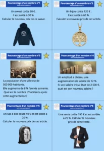 Des cartes autocorrectives pour s’entraîner à calculer le pourcentage d’une quantité, à trouver un pourcentage de réduction ou d’augmentation, trouver un coefficient multiplicateur.